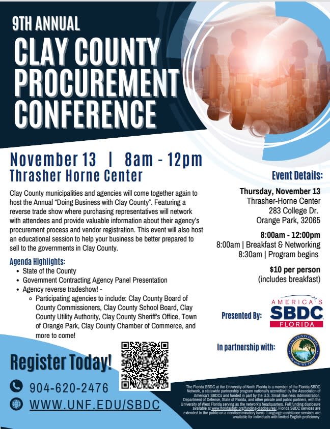 Clay County municipalities and agencies will come together again to host the 9th Annual “Doing Business with Clay County”. Featuring a reverse trade show where purchasing representatives will network with attendees and provide valuable information about their agency’s procurement process and vendor registration. This event will also host an educational session to help your business be better prepared to sell to the governments in Clay County. Agenda Highlights: State of the County Government Contracting for Small Businesses Panel Agency reverse tradeshow! Participating agencies include: Clay County Board of County Commissioners, Clay Electric, Clay County Clerk & Comptroller, Clay County Economic Development Corp., Clay County School Board, Clay County Utility Authority, Clay County Sheriff's Office, Clay County Chamber of Commerce, and more to come! Presented by the Florida SBDC at UNF in partnership with Clay County Florida