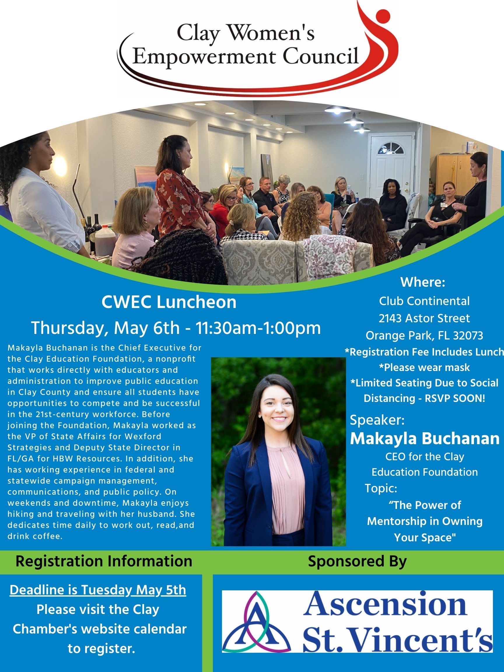 Clay Women's Empowerment Council first Thursday of every month. This Council will be back to in-person at The Club Continental.