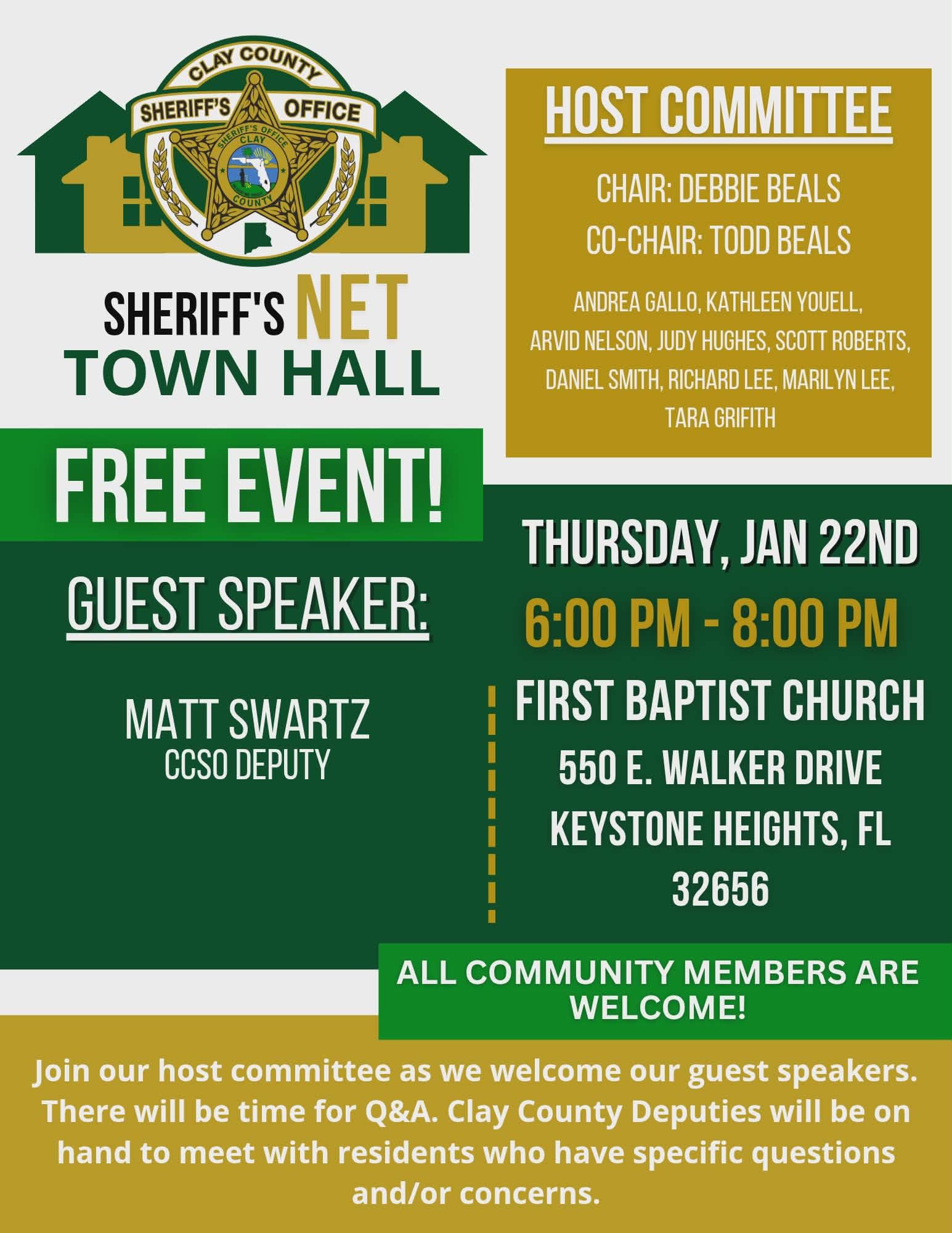 Quarterly joint meeting with our member, Clay County Sheriff's Office. Dinner is free. Guest speaker, CCSO Deputy Matt Swartz.